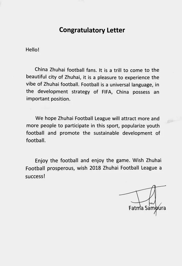 2018珠海市足球聯(lián)賽得到了各方面的關(guān)心和支持,包括國際足聯(lián)秘書長(zhǎng)法特瑪·薩姆拉和Soccerex主席托尼·馬丁等國際足壇巨擘,親自為珠海市足球聯(lián)賽發(fā)來了賀信。