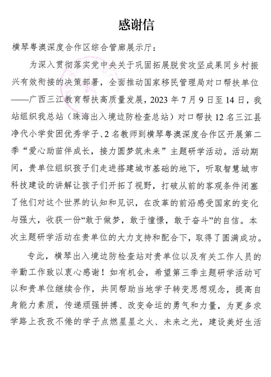 積極協(xié)助橫琴出入境邊防檢查站的“愛心助苗伴成長(zhǎng),接力圓夢(mèng)筑未來”活動(dòng),從云端到地下娓娓介紹,幫助優(yōu)秀三江學(xué)子感知國際化都市的發(fā)展脈搏,了解智慧城市的科技建設(shè),得到橫琴出入境邊防檢查站和參觀學(xué)子的肯定和感謝。