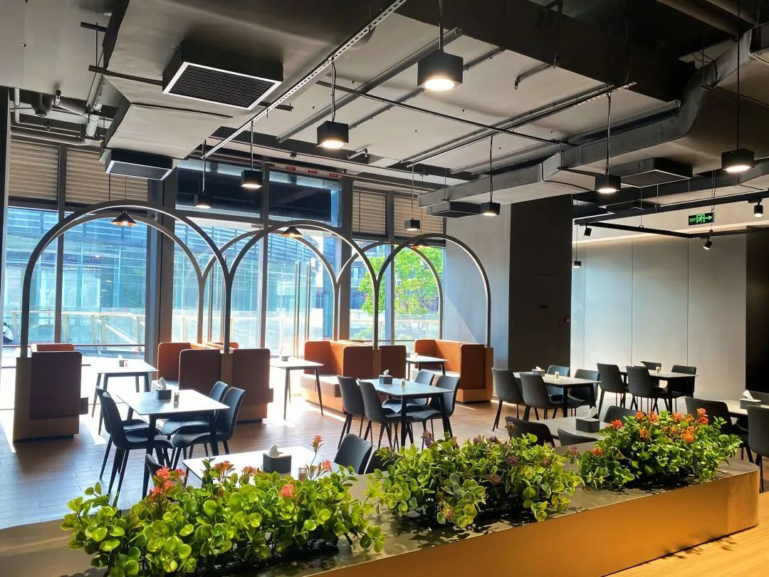 沒有鮮艷的色調(diào),摒棄傳統(tǒng)辦公空間所青睞的金碧輝煌風,改用棕色座椅搭配著灰白色地毯,咖色沙發(fā)搭配棕紅色背景墻,慢慢過渡的色彩讓整個空間更加柔和、干凈和高雅,無論是辦公還是社交,都能給人提供一個有溫度的空間,讓科創(chuàng)er的工作和生活連結(jié)地更加融洽。