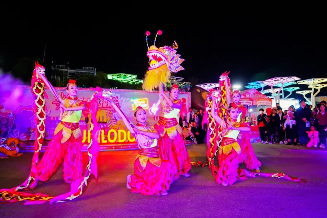 歡慶甲辰龍年元宵佳節(jié)的橫琴星樂度·露營小鎮(zhèn),絢麗燈光流光溢彩,以傳統(tǒng)文化和沉浸式光影場景打造一個(gè)“不夜城”。