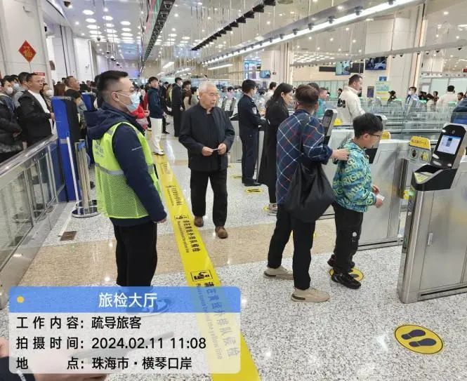 相較往年,今年春節(jié)橫琴口岸呈現出客流高峰提前、持續(xù)時間長、出入高峰疊加等特點,2月11日至16日(大年初二至初七)連續(xù)6天出入單向客流均超過3萬人次。其中,2月12日(大年初三)橫琴口岸單日客流超8.2萬人次,創(chuàng)橫琴口岸成立以來歷史新高。為應對春節(jié)期間口岸高位客流,珠海大橫琴口岸實業(yè)有限公司(下稱大橫琴口岸公司)節(jié)前召開專題會議,提前部署應急人員、物資、設備等通關安全保障;春節(jié)期間,根據客流量變化,大橫琴口岸公司通過科學增加人力、設置蛇形緩沖通道、屏幕投放指引等措施,多管齊下加強出入境旅客分流引導,防止因高客流量發(fā)生擁擠、踩踏等治安事件的發(fā)生。另外在現場設置“特別通道”,為老人、孕婦和殘疾人等行動不便的旅客提供便利,并設置了醫(yī)療救援,以備過關旅客有不時之需。
