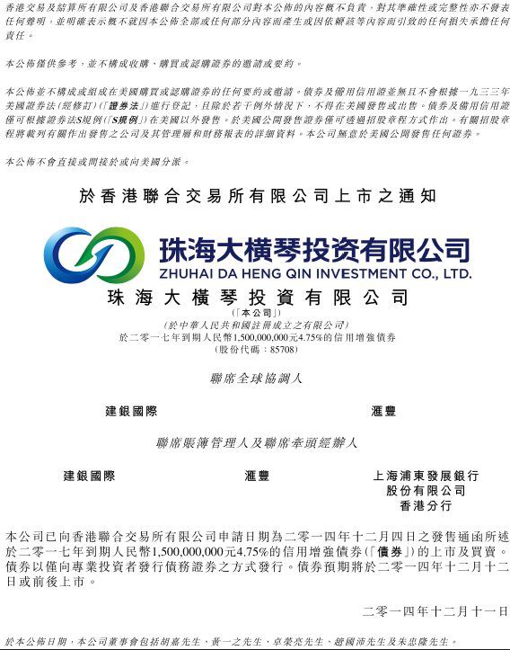 大橫琴投資有限公司債券于 香 港 聯(lián) 合 交 易 所 有 限 公 司 上 市 之 通 知